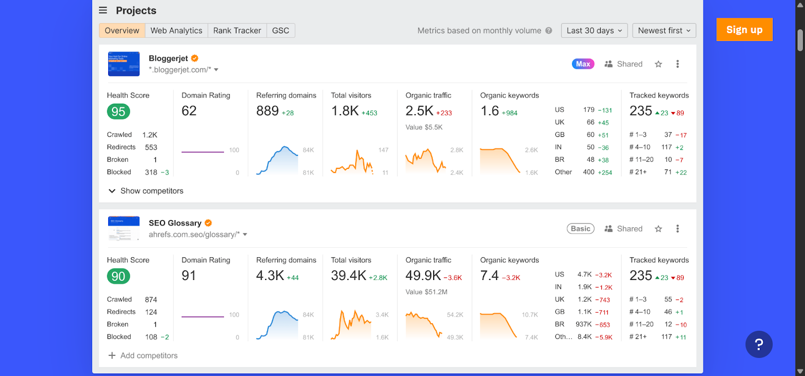 Rank Tracker monitors keyword positions over time across countries, devices, and search engines so you can measure the impact of SEO work.